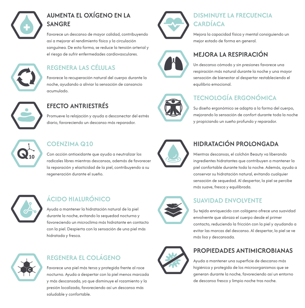 36cm de grosor con tecnología Biocrystal©, Ácido Hialurónico y Coenzima Q10 capaces de transformar cada noche en un proceso real de recuperación para el cuerpo y la piel.