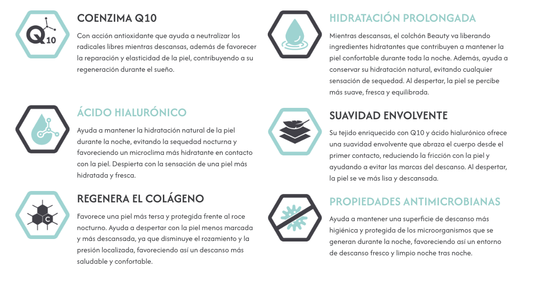 - CAPA 1 STRECH BEAUTY (1 cm): Tejido flexible de gran gramaje y elasticidad que proporciona comodidad y suavidad en el descanso. Con tratamiento de colágeno, ácido hialurónico y coenzima Q10.